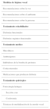 La voz normal depende de cada oyente en base a criterios socioculturales, educacionales, laborales y ambientales, así como de la percepción individual. El abuso de tóxicos, traumatismos, actividades profesionales o enfermedades asociadas son posibles factores de riesgo para causar disfonía. Existen varios tipos de disfonía: orgánicas, funcionales y orgánico-funcionales; si hay lesiones anatómicas en las cuerdas vocales o un mal uso y abuso vocal. El diagnóstico de un paciente con disfonía es una anamnesis y un examen clínico e instrumental para observar las cuerdas vocales en reposo y en movimiento. Es importante valorar el grado de incapacidad y repercusión emocional que una alteración vocal provoca en la vida diaria y profesional de una persona. El signo de alerta de una neoplasia suele ser la disfonía continua de tres semanas de evolución. Las principales medidas terapéuticas para un paciente con disfonía son higiene vocal, tratamiento rehabilitador, médico y quirúrgico.