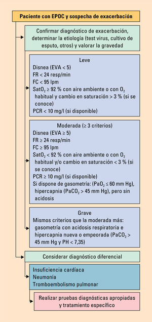 Chronic obstructive pulmonary disease (COPD) is a highly prevalent respiratory disease characterized by a limitation in airflow that is not fully reversible. Its origin is multifactorial. Tobacco smoke is the main cause, although genetic, environmental, and occupational factors also play a role. COPD encompasses different patient profiles (clinical phenotypes), most notably emphysema, chronic bronchitis, and the mixed COPD-asthma phenotype (currently redefined as COPD with a T2 profile). Diagnosis requires confirmation via spirometry with a bronchodilator test. Given its marked clinical and functional heterogeneity, treatment should be tailored to the patient's profile, severity of symptoms, risk of exacerbations, and associated comorbidities. The most effective intervention to modify its natural course is smoking cessation. Long-acting bronchodilators are the mainstay of pharmacological treatment and their combination with inhaled corticosteroids is indicated in patients with frequent exacerbations and inflammatory features. In advanced stages, management should be multidimensional, attempting to cover all of the patient's treatable features.