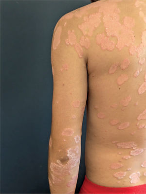 Varón de 52 años con lesiones cutáneas pruriginosas, descamativas en codos, rodillas, cuero cabelludo y región lumbar con artralgias en las manos